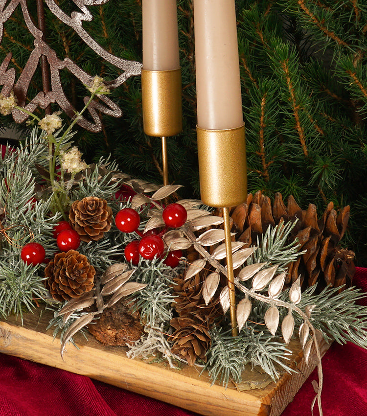 Centrotavola Natalizio in legno con un Abete in corten, Candele e piante