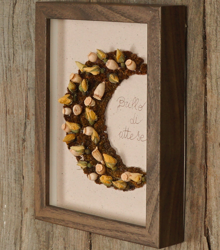 Cornice in legno "Brilla di attese" con una Mezzaluna di fiori essiccati