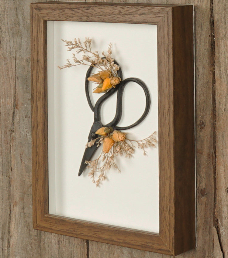 Cornice in legno con delle Forbici in metallo e fiori essiccati