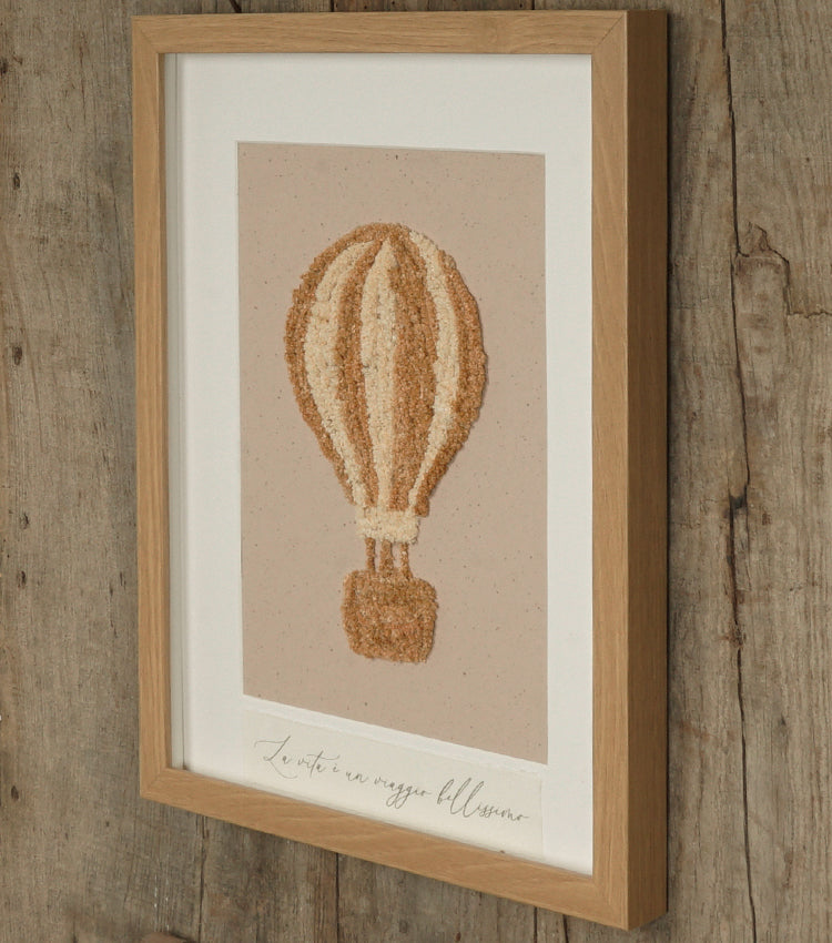 Cornice in legno "La vita è un viaggio bellissimo" con una Mongolfiera di fiori essiccati