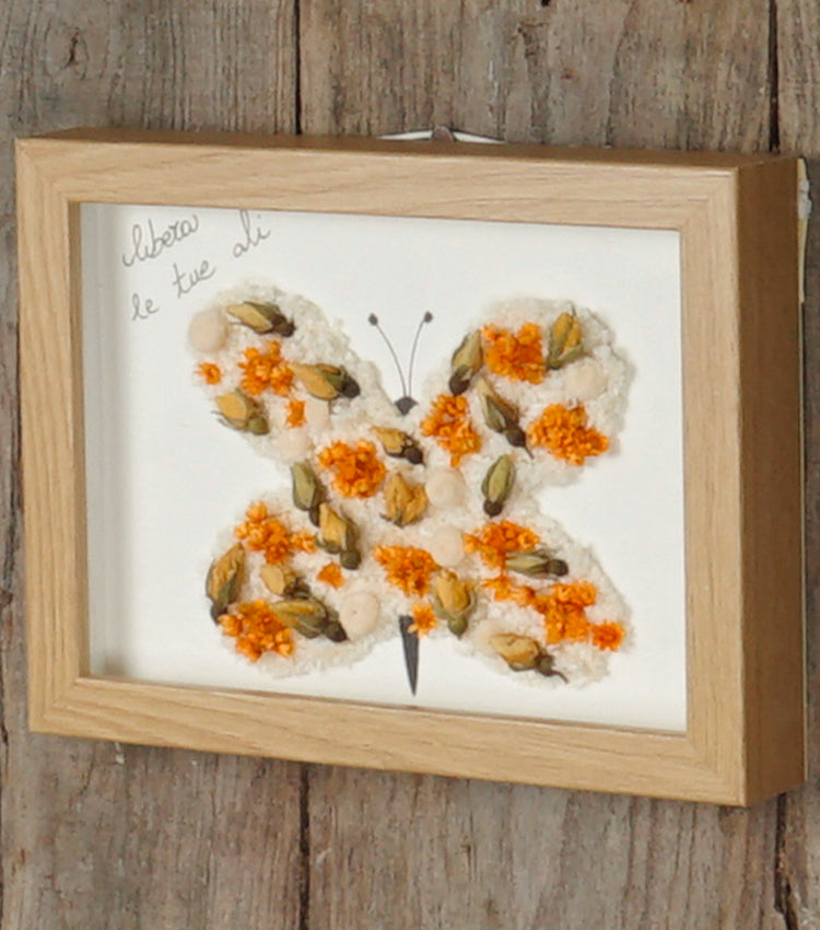 Cornice in legno "libera le tue ali" con una Farfalla di fiori essiccati