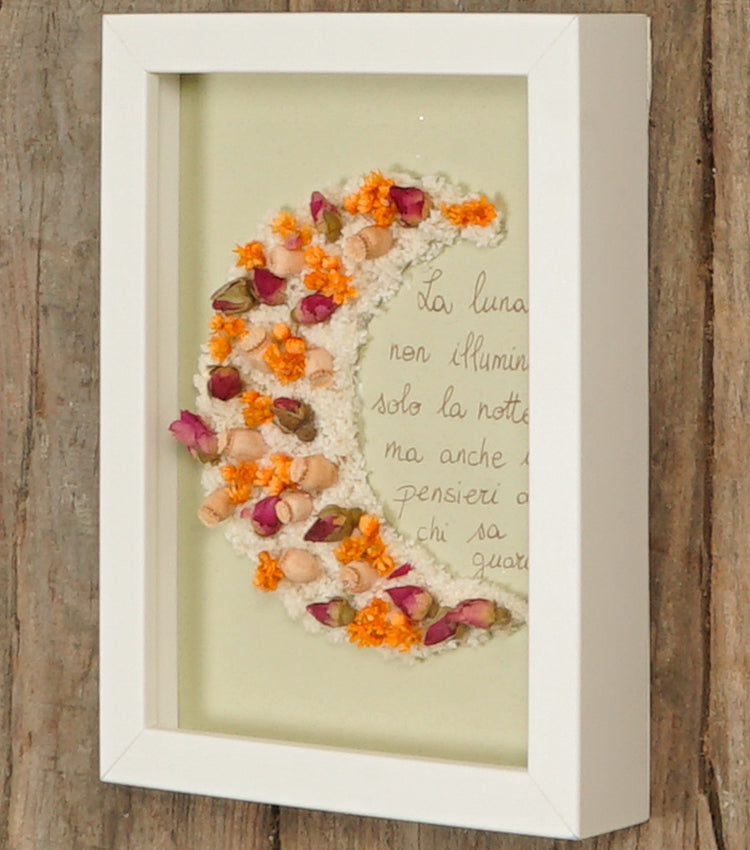 Cornice in legno piccola con una Mezzaluna di fiori essiccati e un Aforisma