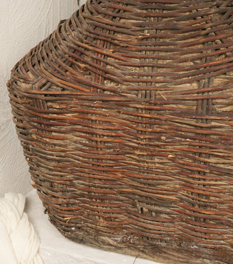 Damigiana Vintage da appoggio bi-facciale realizzata interamente in vimini lavorato e dipinto dallo stile vintage e rustico.