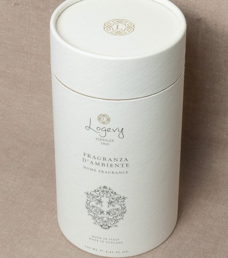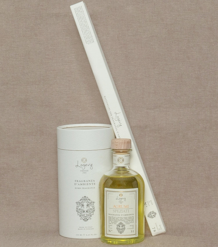 Fragranza d'Ambiente munita della scatola di carta con i Bastoncini di legno alla profumazione "Agrumi Speziati" da 250 ml della linea "Logevy".