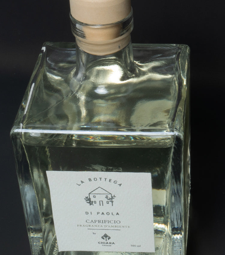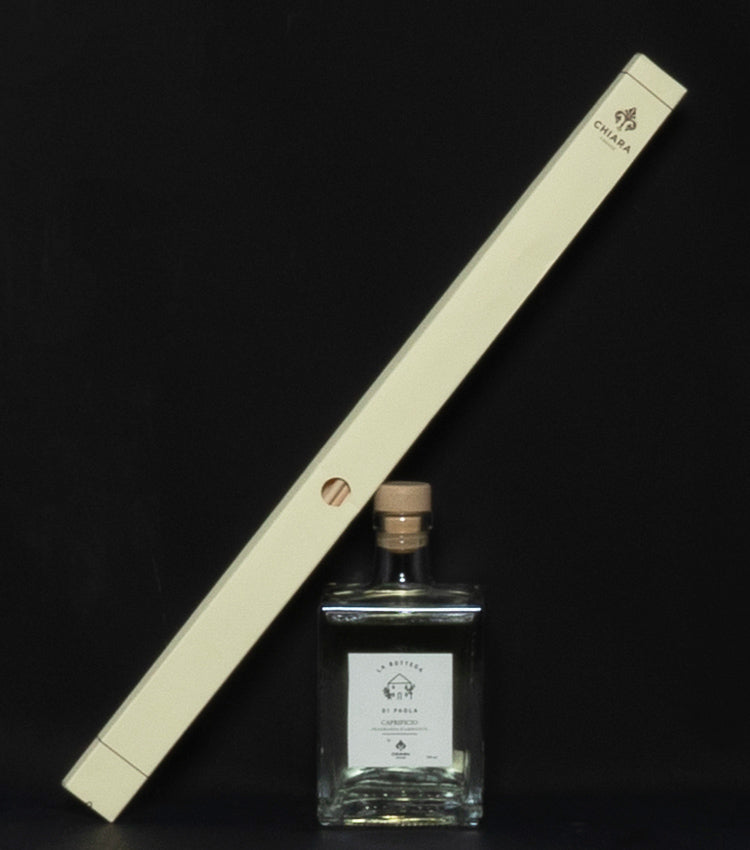 Fragranza d'Ambiente munita della scatola di carta con i Bastoncini di legno alla profumazione "Caprificio" da 500 ml della linea "Chiara Firenze".
