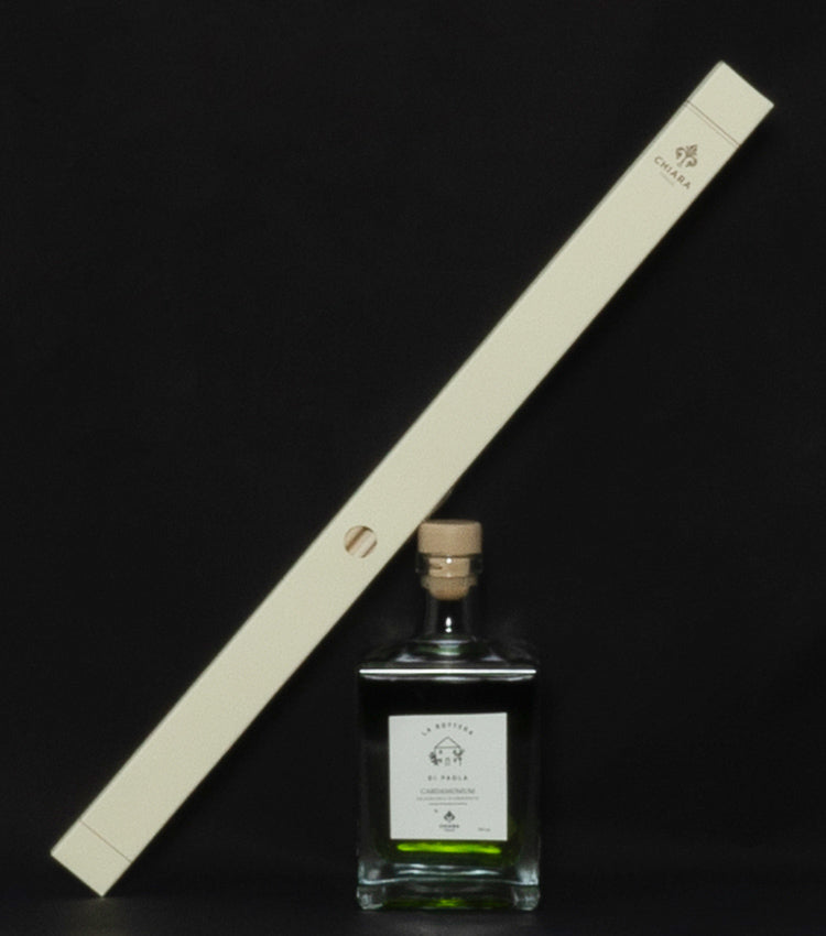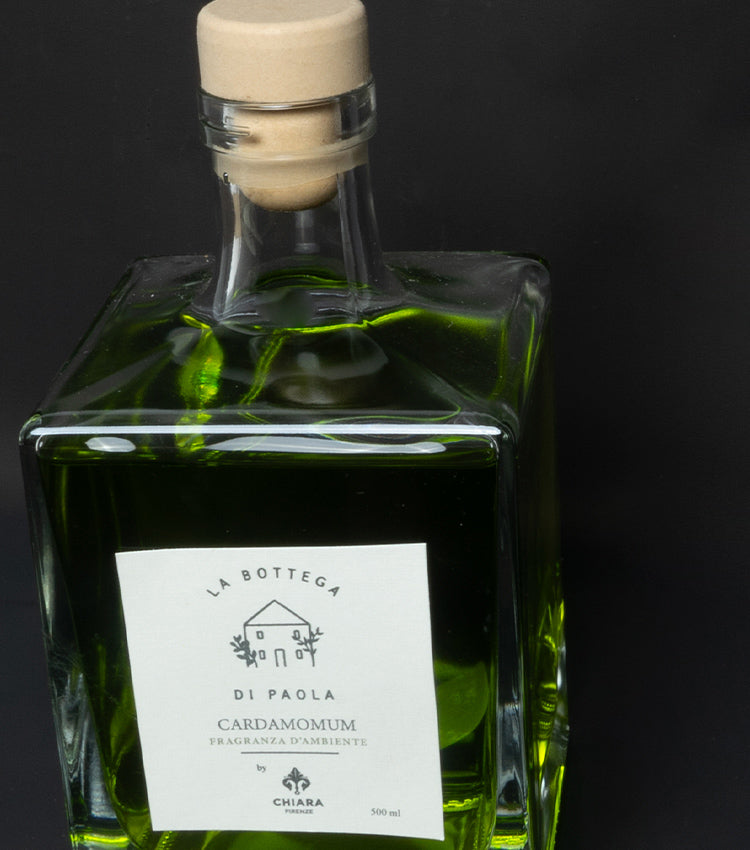 Fragranza d'Ambiente munita della scatola di carta con i Bastoncini di legno alla profumazione "Cardamomum" da 500 ml della linea "Chiara Firenze".