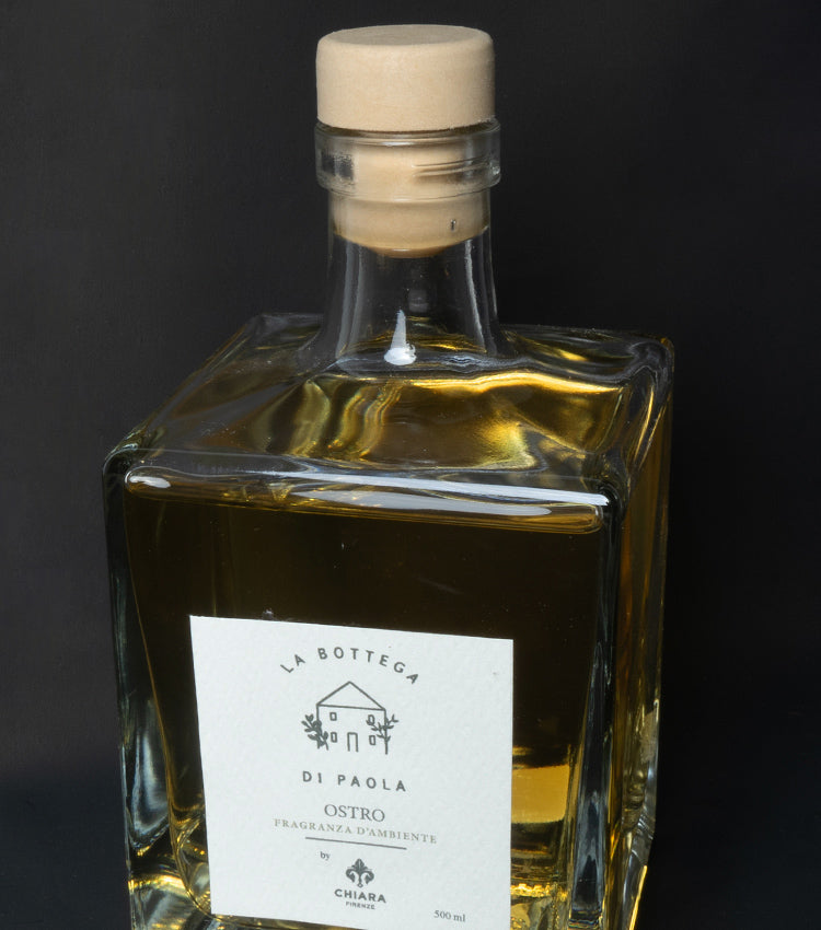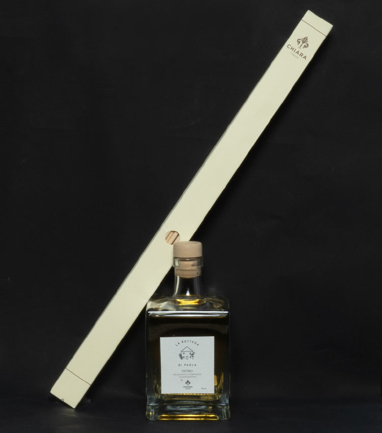 Fragranza d'Ambiente munita della scatola di carta con i Bastoncini di legno alla profumazione "Ostro" da 500 ml della linea "Chiara Firenze".