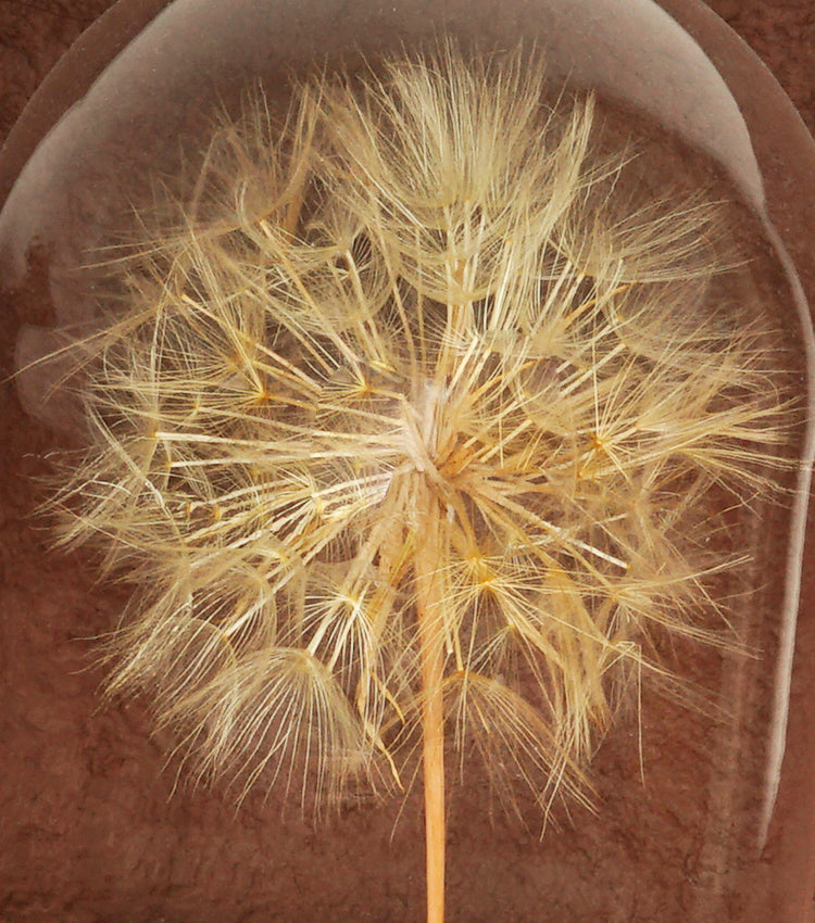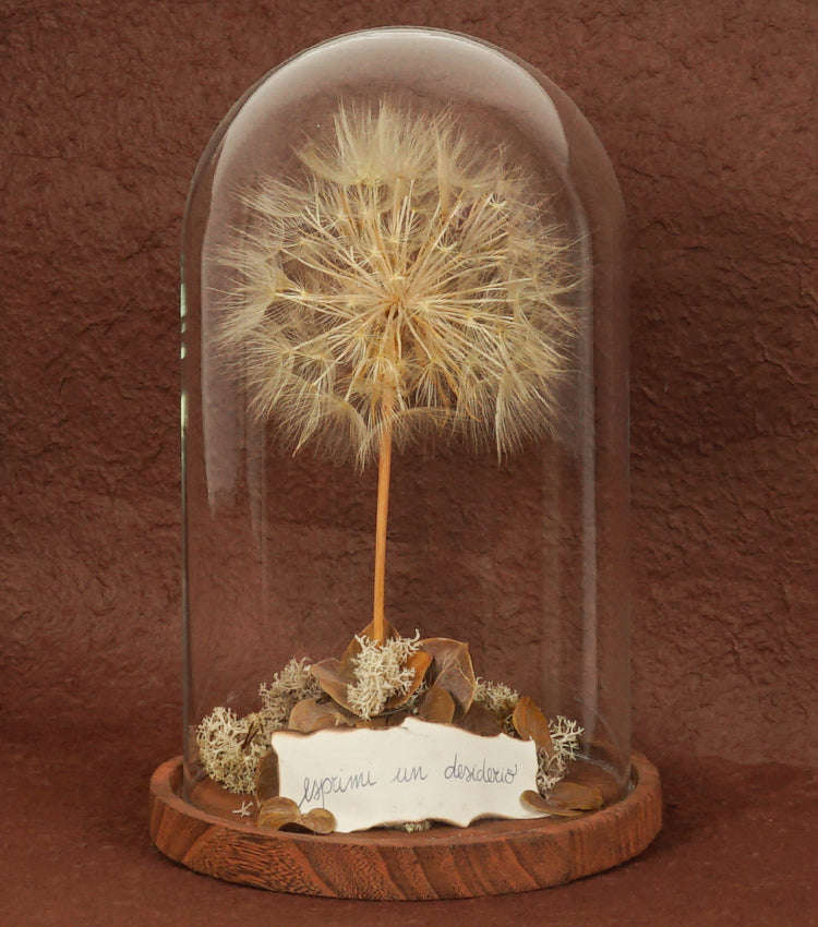 "Il Grande Soffione nella Boule" in vetro e legno con una scritta, carta e piante essiccate e stabilizzate