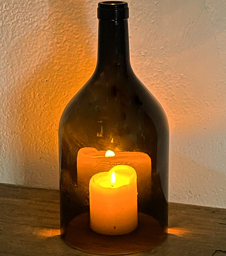 Paralume a forma di una Mezza Bottiglia da appoggio bi-facciale realizzato interamente in vetro lavorato e colorato dallo stile vintage ed invecchiato.