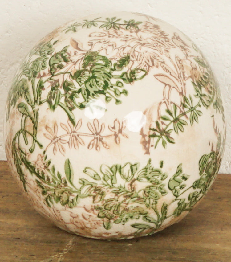 Sfera con Decorazioni da appoggio bi-facciale realizzata interamente in cotto smaltato decorato e dipinto di diverse colorazioni dallo stile vintage e rustico.