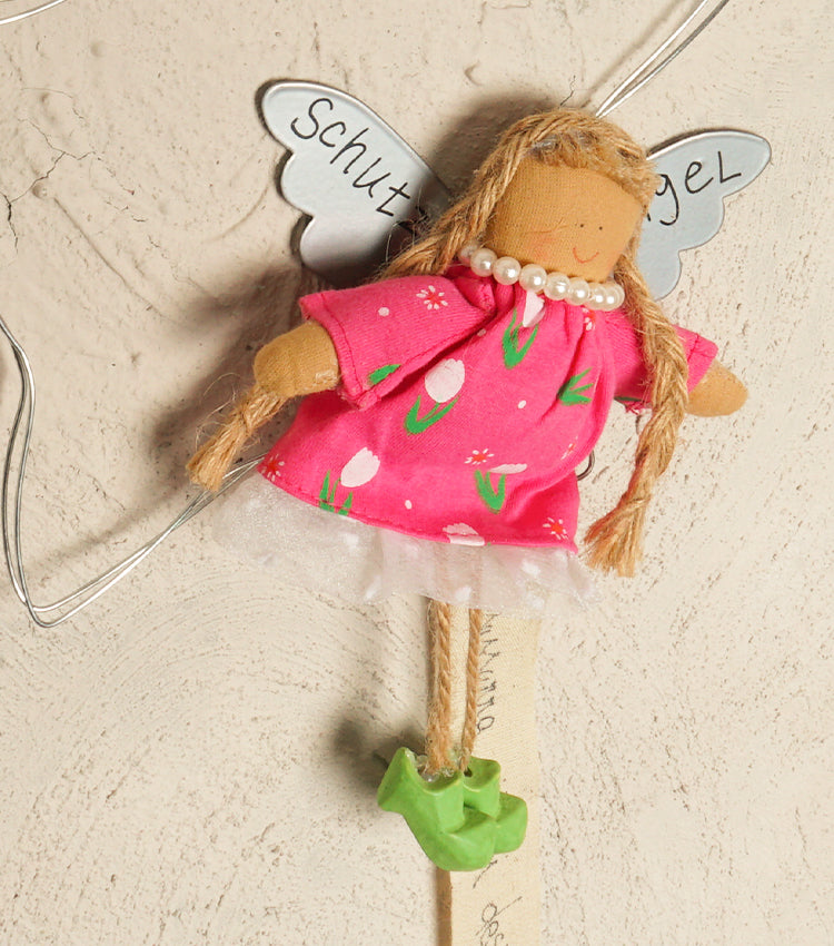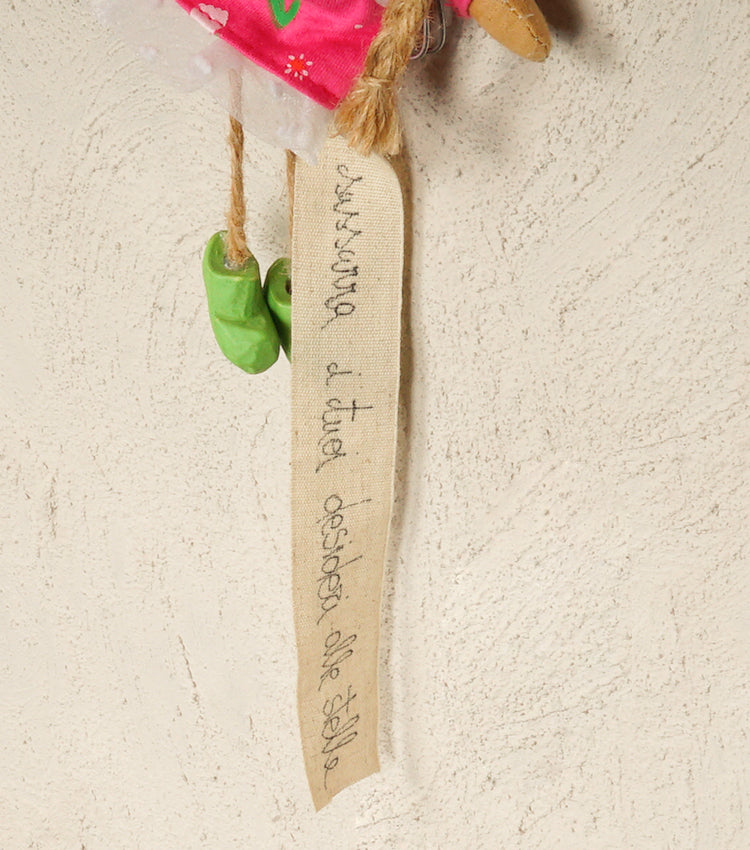 Stellina da appendere realizzata interamente da noi con fil di ferro lavorato, un aforisma scritto su tessuto ed uno "Schutz Engel" di pezza, legno, metallo, corda e plastica di diverse colorazioni. Nella parte superiore è presente il nastro per appenderlo.