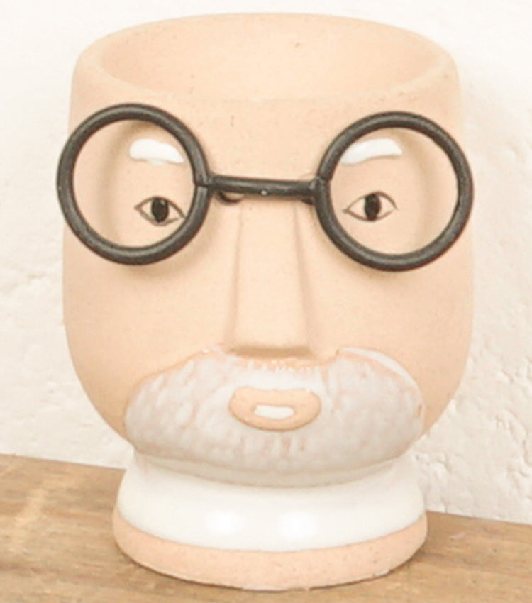 "Vasetto a forma di un Uomo con la Barba" da appoggio realizzato in cotto in parte smaltato con gli occhiali di metallo lavorato e dipinto.